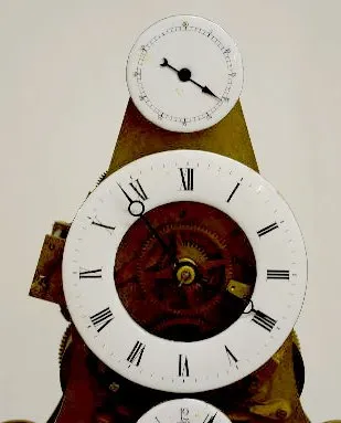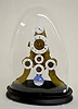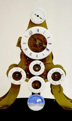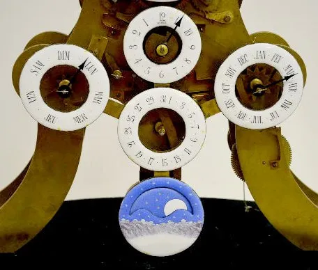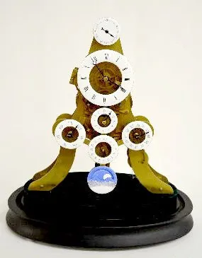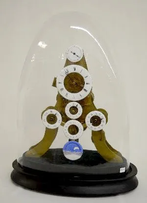 Contemporary 7 Function Skeleton Clock With a brass movement and a porcelain dial with moon phase. Not tested. 24 1/2" Tall with the dome.