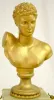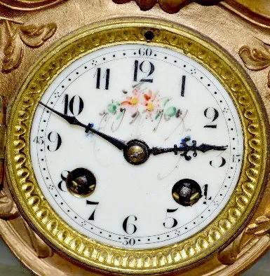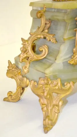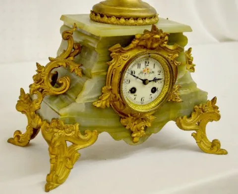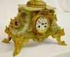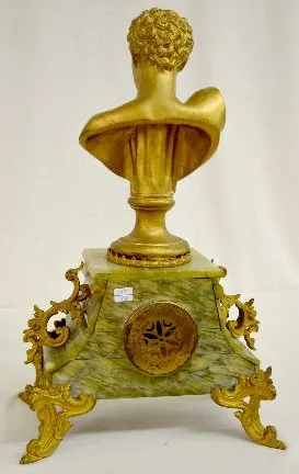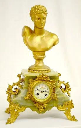 Marque Depose Mantel Clock - Onyx with Hermes The Marque mark includes an "M" in a wreath, with Depose and No. 2184 nearby. It has a bell strike with 1/2 hour strike movement. The green onyx case is topped with a spelter figure of Hermes. The clock does run and strike. (The clock runs and strikes for a while, then it stops. The case has hairlines below and to the right of the dial. The figure has been repainted.) Dial - 3 1/2" Diameter; Case - 21 1/2" Tall The collection's appraiser relates the Marque mark to Japy Freres.
