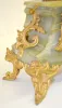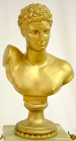 The Marque mark includes an "M" in a wreath, with Depose and No. 2184 nearby. It has a bell strike with 1/2 hour strike movement. The green onyx case is topped with a spelter figure of Hermes. The clock does run and strike. (The clock runs and strikes for a while, then it stops. The case has hairlines below and to the right of the dial. The figure has been repainted.) Dial - 3 1/2" Diameter; Case - 21 1/2" Tall The collection's appraiser relates the Marque mark to Japy Freres.