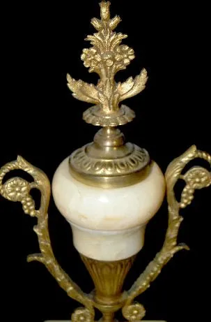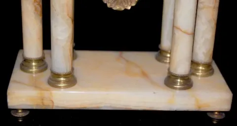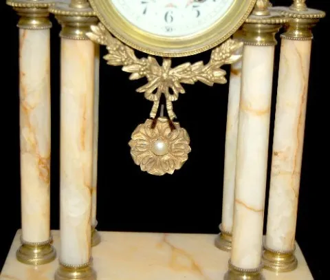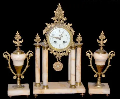 3 Piece Marble Clock Garniture Set The bell striking movement is marked - "SOCIETE CLUSIENNE S.C.A.P.H. CLUSES", "No. 39101" & 185 M/M. The dial is floral painted with pierced hands. The case has 6 columns. The pendulum is with the clock. (The clock is not running at this time.) Dial - 4" Diameter; Clock - 16" Tall x 9 1/8" Wide; Side pieces 11 1/2" Tall..