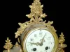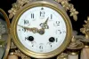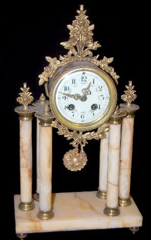 The bell striking movement is marked - "SOCIETE CLUSIENNE S.C.A.P.H. CLUSES", "No. 39101" & 185 M/M. The dial is floral painted with pierced hands. The case has 6 columns. The pendulum is with the clock. (The clock is not running at this time.) Dial - 4" Diameter; Clock - 16" Tall x 9 1/8" Wide; Side pieces 11 1/2" Tall..