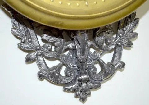 French Brass & Metal Hanging Clock, Bird Nest TO movement and a metal dial with brass cartouche numbers. The case has a bird nest decorated finial with griffin head side mounts. The key is with the clock. Not tested. 15" Tall x 9" Wide