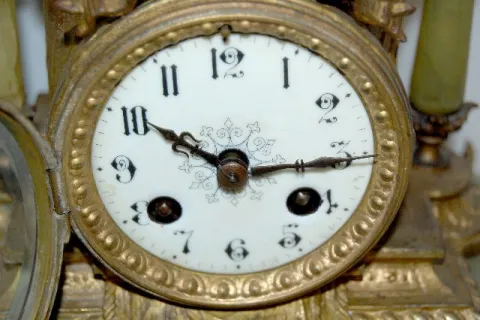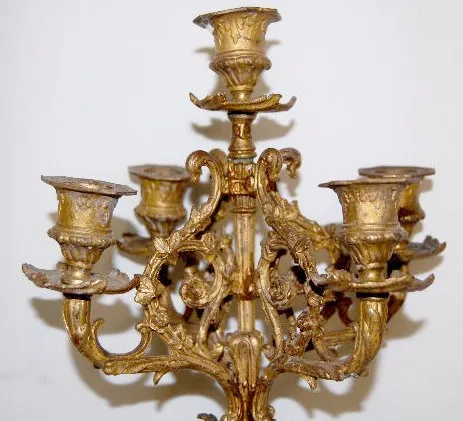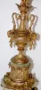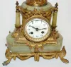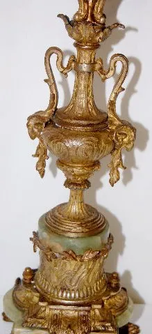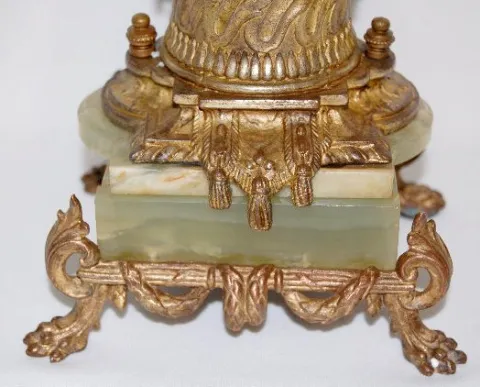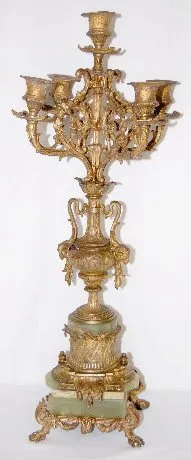 The bell striking movement is No. 17942. The dial looks OK. The green onyx and white metal case has a winged angel with a sword. The side pieces are 5 cup candelabras. The springs wind correctly. (The clock is not running at this time - there is no bell or pendulum. The gilt finish is worn and dirtied. An arm on one candelabra needs to be re-attached.) Dial - 3 1/4" Diameter; Clock - 22" Tall; Side Pieces - 21" Tall