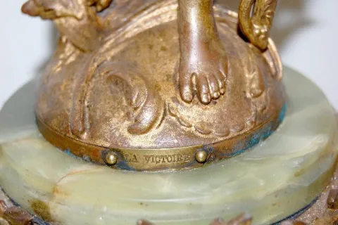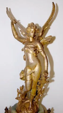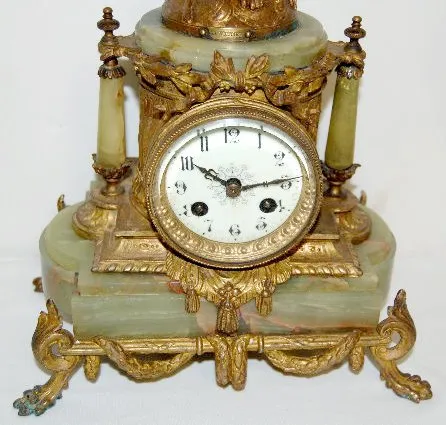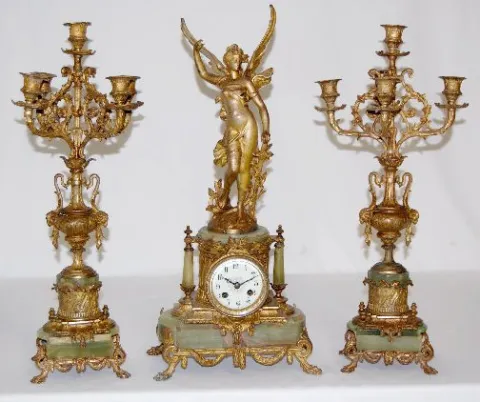 French 3 Pc. Clock Set, "La Victoire" w/Winged Angel The bell striking movement is No. 17942. The dial looks OK. The green onyx and white metal case has a winged angel with a sword. The side pieces are 5 cup candelabras. The springs wind correctly. (The clock is not running at this time - there is no bell or pendulum. The gilt finish is worn and dirtied. An arm on one candelabra needs to be re-attached.) Dial - 3 1/4" Diameter; Clock - 22" Tall; Side Pieces - 21" Tall