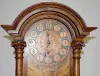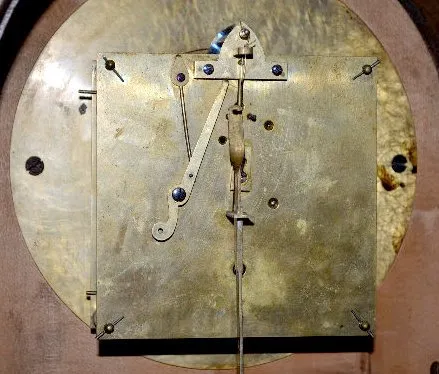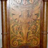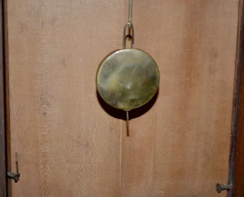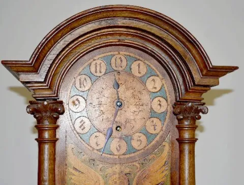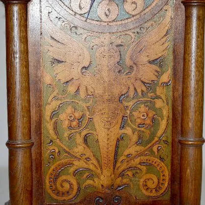 With unmarked TO brass works; silk thread suspension and a burnt wood decorated dial and clock front. The clock front also has a stylized angel with scrolls and flowers on it. (The clock is not running at this time. There is a new backboard with beveled glass.) 23" Tall