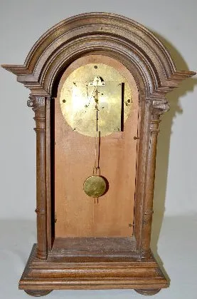 Oak 30 Day Pyrographic Shelf Clock With unmarked TO brass works; silk thread suspension and a burnt wood decorated dial and clock front. The clock front also has a stylized angel with scrolls and flowers on it. (The clock is not running at this time. There is a new backboard with beveled glass.) 23" Tall