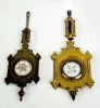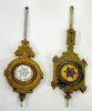 4 Welch Pressed Glass Colored Clock Pendulums There is one with a pink and white pinwheel; one with a red and white 6-point star in gold; one with a red and white 6-point star in white; an "Eclipse" with a green and white 6-point star. All are in as found used condition. Longest 8"