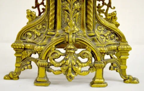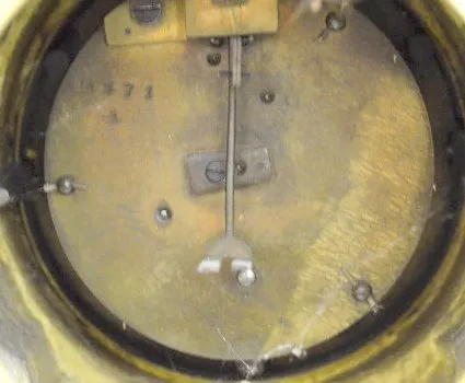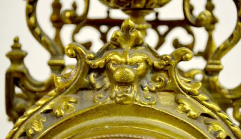 With a plain TO movement marked "6371" and a decorative porcelain dial. In an all brass case with a lion mask; scrolls and an urn top. The pendulum is with the clock. (The clock is not running at this time.) (There is no key with the clock.) 19" Tall