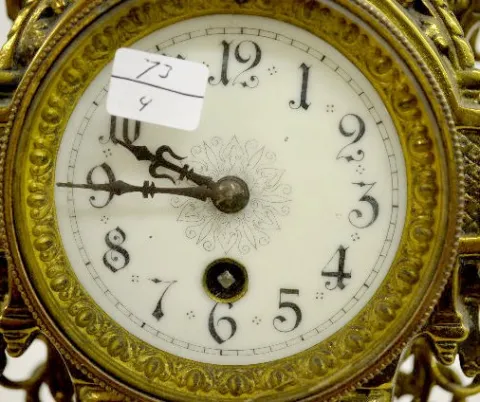 French Brass Urn Top Mantel Clock With a plain TO movement marked "6371" and a decorative porcelain dial. In an all brass case with a lion mask; scrolls and an urn top. The pendulum is with the clock. (The clock is not running at this time.) (There is no key with the clock.) 19" Tall