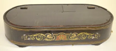 Old Wood Musical Base to a Clock In the ebonized wood base there is a 4 1/4" cylinder music maker with No. 7535 on it. The cylinder looks good. There is no indication of how many tunes it plays. (The comb has 5 broken prongs - which doesn't seem to have affected the sound at all.) Oval shaped, it is 4 1/4" x 21 5/8" Wide x 10 1/4" Deep