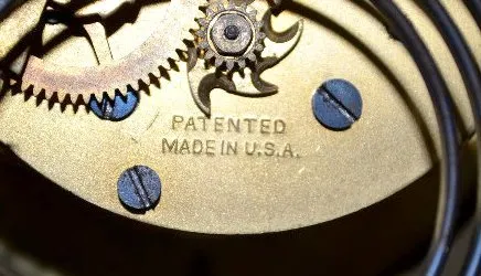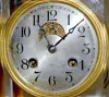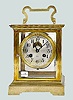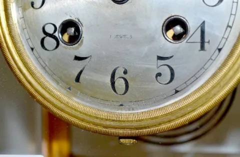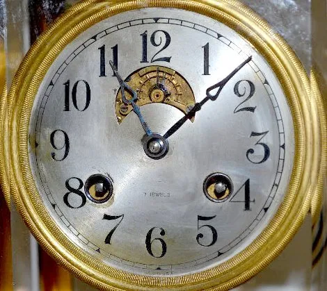 In a brass and beveled glass case with an 8 day T&S movement marked "Patented Made in U.S.A."; a silvered dial marked "7 Jewels" and "Made in U.S.A." ...