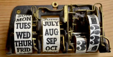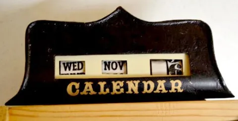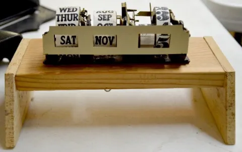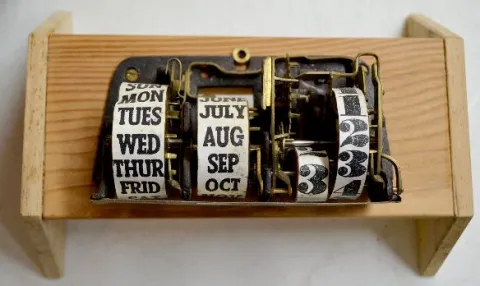 Cast Iron Calendar Top Mechanism, built by Mr. Broline. Has the cast iron case with the mechanism mounted on a new board. The back is painted with the words "Patented Dec. 24, 1872 Manufactured by Simmons & Co. Macomb, Ill." the front is painted with the word "Calendar". This can be mounted on a flat top clock.