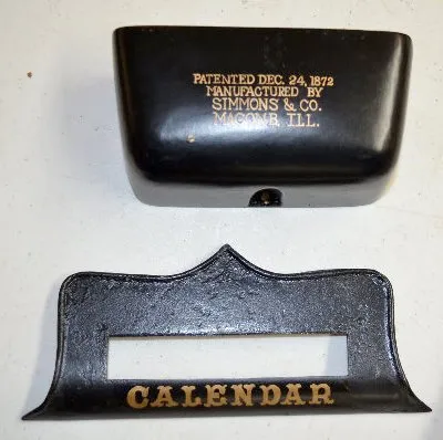 Cast Iron Calendar Top Mechanism Cast Iron Calendar Top Mechanism, built by Mr. Broline. Has the cast iron case with the mechanism mounted on a new board. The back is painted with the words "Patented Dec. 24, 1872 Manufactured by Simmons & Co. Macomb, Ill." the front is painted with the word "Calendar". This can be mounted on a flat top clock.