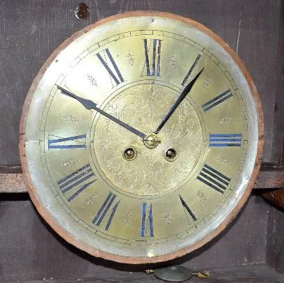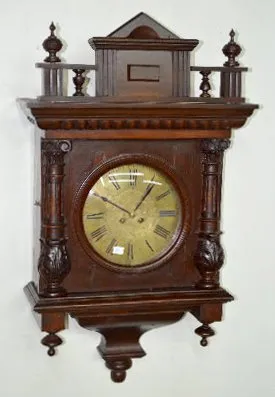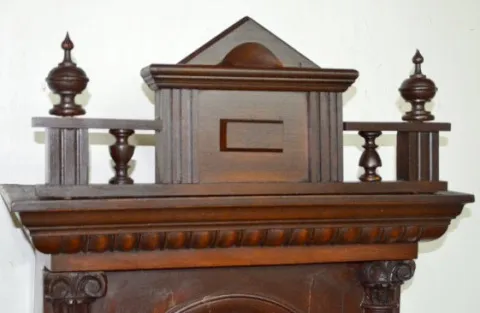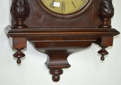 With an unmarked silver colored etched dial in a mahogany case. The pendulum is with the clock. Not tested. (There is no key with the clock.) 34" Tall...