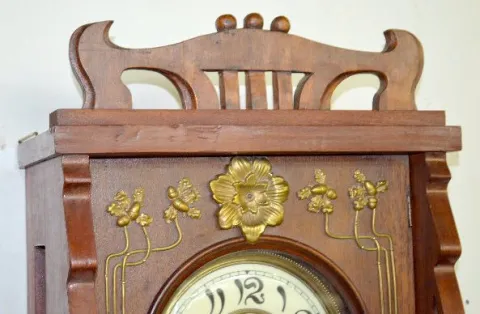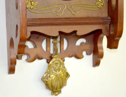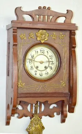 Art Nouveau Free Swinger Wall Clock In a mahogany case with floral metal trim and pendulum. The 2 piece porcelain dial has Arabic Numerals on it. Not tested. (There are minor flaws to the finish.) 24" Wide