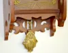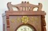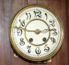 In a mahogany case with floral metal trim and pendulum. The 2 piece porcelain dial has Arabic Numerals on it. Not tested. (There are minor flaws to the finish.) 24" Wide