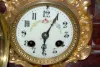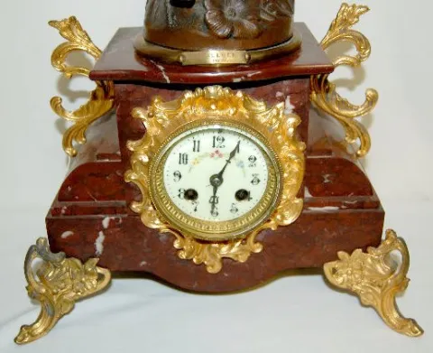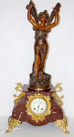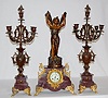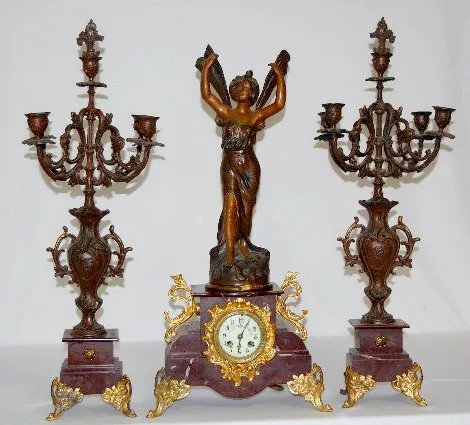 French 3 Piece Clock Set w/Fairy The hour and 1/2 hour bell striking movement is No. 14707 and otherwise unmarked; with an enamel dial. The figure, "LIBELLULE" by Ruchot, is of a winged woman made of white metal. The figure and the 5 cup candle holder side pieces are on very dark maroon marble. The candle holders are also made of white metal. The clock is running and striking at this time. (The gilt decoration is worn on the front feet of the case. The figure is not attached to the clock. Some of the original finish on the figure is worn off. An arm on one side piece has been re-attached. Another has 2 or 3 joints that are separated.) Dial - 3 1/4" Diameter; Clock - 27" Tall x 13 3/4" Wide; Side Pieces - 25 3/4" Tall x 12 1/2" Wide.