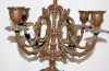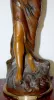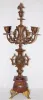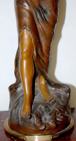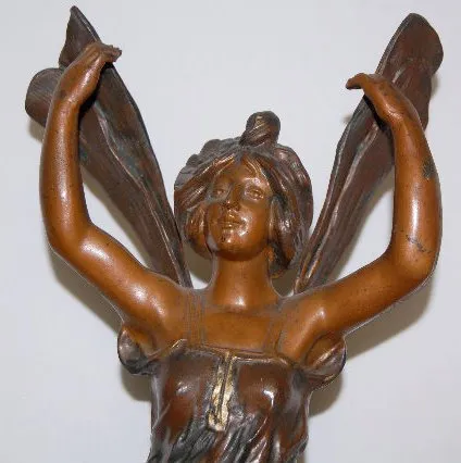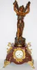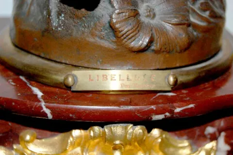 The hour and 1/2 hour bell striking movement is No. 14707 and otherwise unmarked; with an enamel dial. The figure, "LIBELLULE" by Ruchot, is of a winged woman made of white metal. The figure and the 5 cup candle holder side pieces are on very dark maroon marble. The candle holders are also made of white metal. The clock is running and striking at this time. (The gilt decoration is worn on the front feet of the case. The figure is not attached to the clock. Some of the original finish on the figure is worn off. An arm on one side piece has been re-attached. Another has 2 or 3 joints that are separated.) Dial - 3 1/4" Diameter; Clock - 27" Tall x 13 3/4" Wide; Side Pieces - 25 3/4" Tall x 12 1/2" Wide.