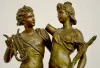 French Marti Marble Double Statue Clock With a T&S movement signed and numbered 4604; an unmarked porcelain dial and the pendulum. The statue is marked "AnPriq" or "An Pig" and stands on a red marble base. Not tested. (There is no key with the clock.) 24 3/8" Tall