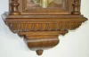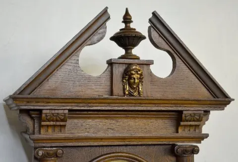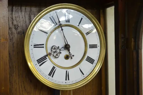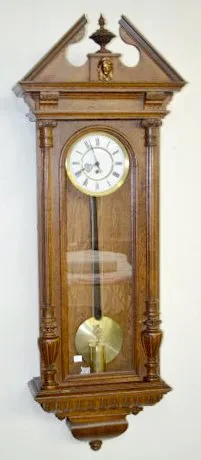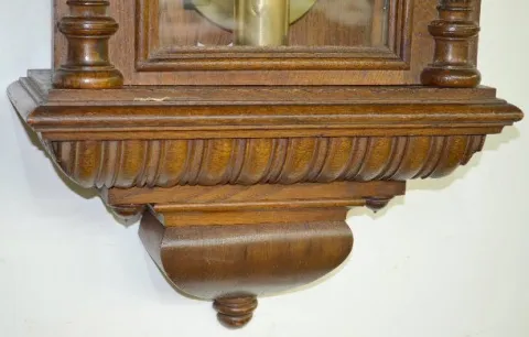 Oak Carved 1 Weight Vienna Wall Clock With a 2 piece porcelain dial and brass trim, pendulum and weights. Not tested. (There are minor scuffs to the case.) Case - 50" Long