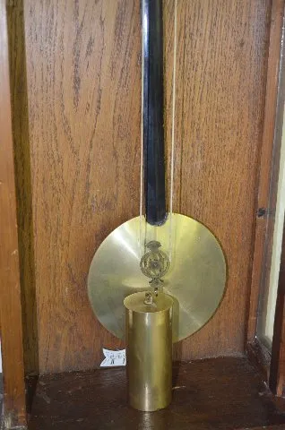 With a 2 piece porcelain dial and brass trim, pendulum and weights. Not tested. (There are minor scuffs to the case.) Case - 50" Long
