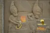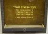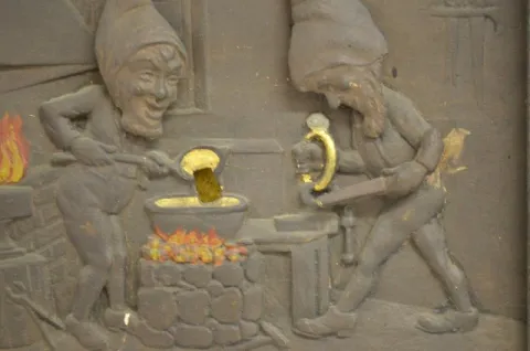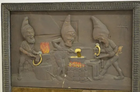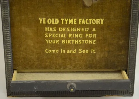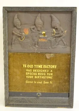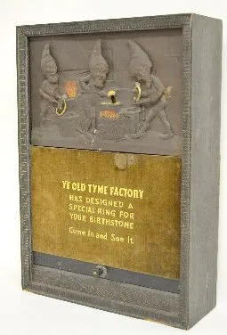 Shows two elves forging rings on an anvil. The front reads "Ye Old Tyme Factory Has designed a special ring for your birthstone - Come and See It". In...