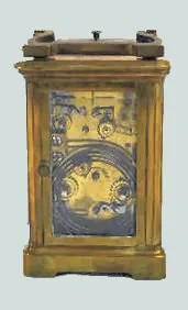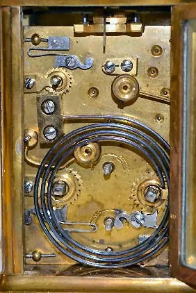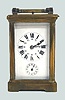 Antique French Striking Alarm Carriage Clock With an unmarked movement and an unmarked porcelain dial. In a beveled glass case with visual top. Not tested. (There is no key with this clock. One corner of the glass on one side of the clock is damaged.) 4 1/2" Tall