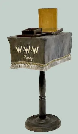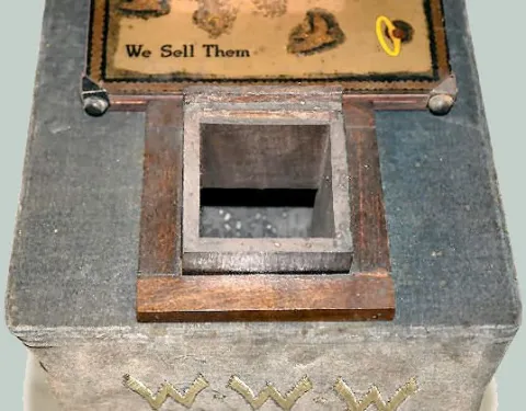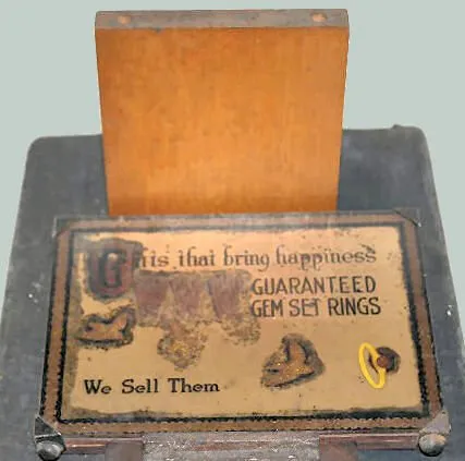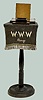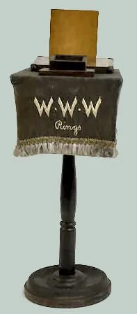 Consists of a round wooden pedestal with a velvet cover embroidered "W.W.W. Rings". There is a reverse painted black glass that reads "Gifts that bring happiness W.W.W. Guaranteed Gem Set Rings." Not tested. (There appears to be parts missing.) 23 1/2" Tall x 7 1/2" Wide x 12" Deep