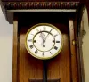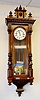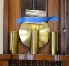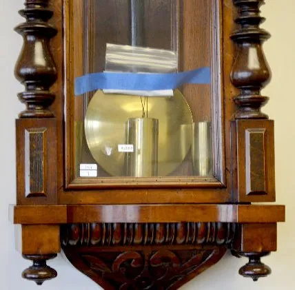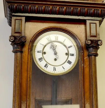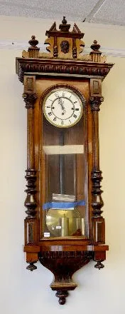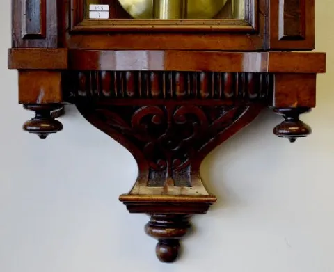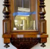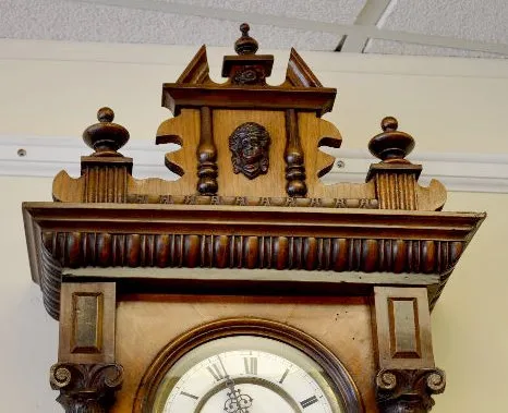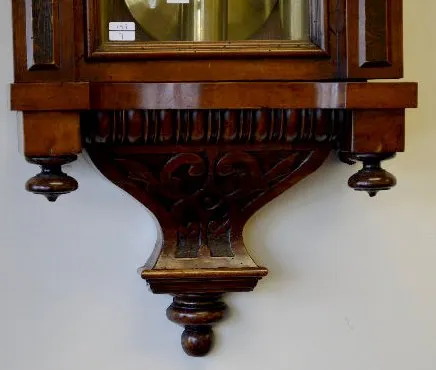 With a T&S movement; an unmarked porcelain dial; side glass; the pendulum and 3 weights. The case has a carved lady crest head and carved columns. Not...