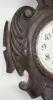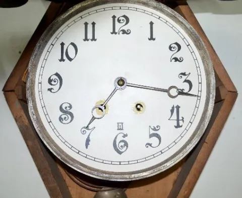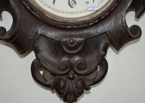 With a T&S movement in a heavily carved oak case. The key and pendulum are with the clock. Not tested. (The dial has been replaced. The bezel has been repaired. There is some damage to the case.) 28" Tall