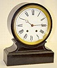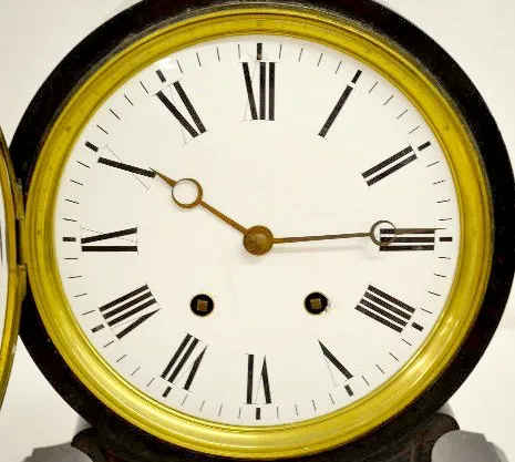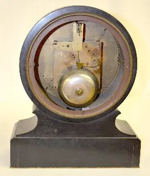 The bell striking with 1/2 hour strike movement is marked GV 30474 & 10.6 and has a porcelain dial. In a plain black slate case. There is a size 15 crank style key with the clock. The clock is running and striking at this time. (The porcelain dial has some chips around one key hole. There are also some surface scratches below and just left of the center of the dial. There is no back access cover.) Dial - 9 1/2" Diameter; Case - 16" Tall x 13" Wide