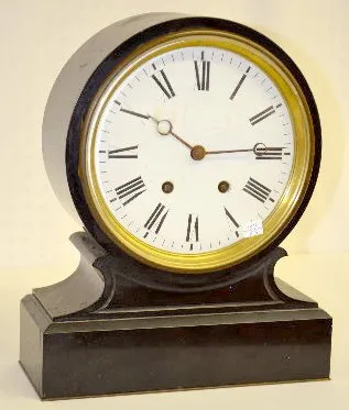 French Black Slate Balloon Clock, 1870 The bell striking with 1/2 hour strike movement is marked GV 30474 & 10.6 and has a porcelain dial. In a plain black slate case. There is a size 15 crank style key with the clock. The clock is running and striking at this time. (The porcelain dial has some chips around one key hole. There are also some surface scratches below and just left of the center of the dial. There is no back access cover.) Dial - 9 1/2" Diameter; Case - 16" Tall x 13" Wide