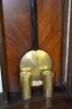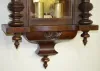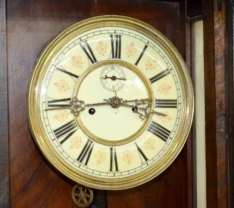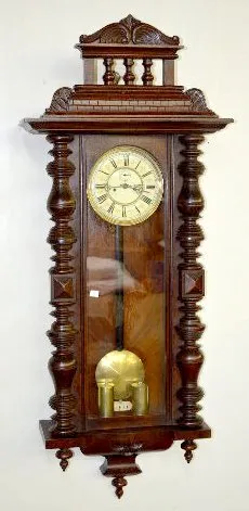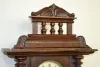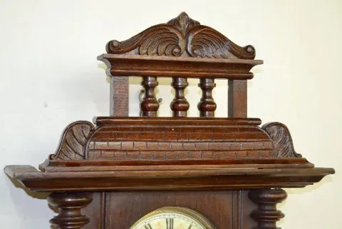 Ornate Carved 2 Weight Wall Clock This clock, in a dark case, has a 2 piece porcelain dial with seconds bit and brass trim, pendulum and weights. Not tested. (There are minor dents to one of the weights.) 50" Long