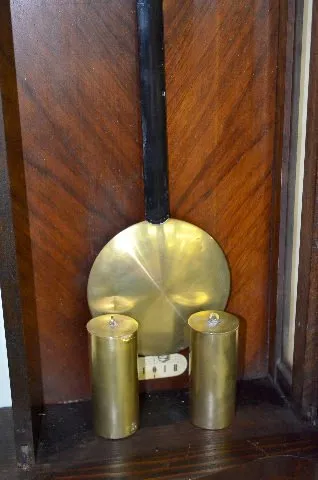 This clock, in a dark case, has a 2 piece porcelain dial with seconds bit and brass trim, pendulum and weights. Not tested. (There are minor dents to one of the weights.) 50" Long