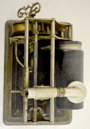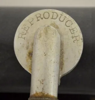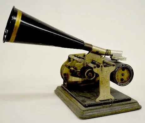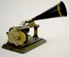American Graphophone 1901; original key and black metal horn; some stenciling on the metal base still exists; the metal black and gold horn is 7 1/2" ...