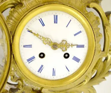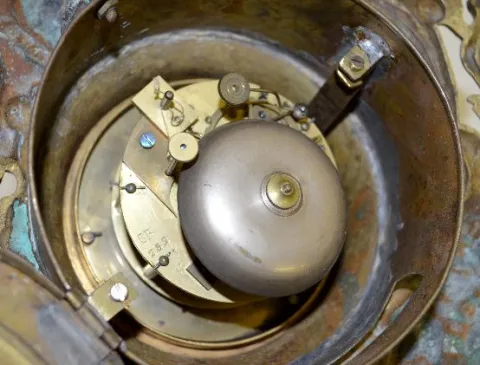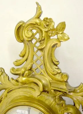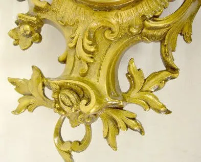 It has a silk string, SR 252, bell striking movement with a porcelain dial. The bronze case has fruit, nut, flower, acanthus leaf and lattice designs. Both the springs are good. Not tested. Dial - 4 1/4" Diameter; Case - 21" Long