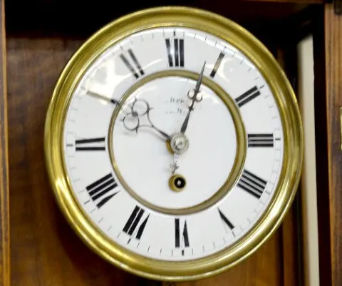 Miniature 1 Weight Vienna Wall Clock The 2 piece porcelain dial has an unreadable signature on it. There is brass trim, pendulum and weight with the clock. Not tested. (The case has been nicely refinished.) Case - 38" Long