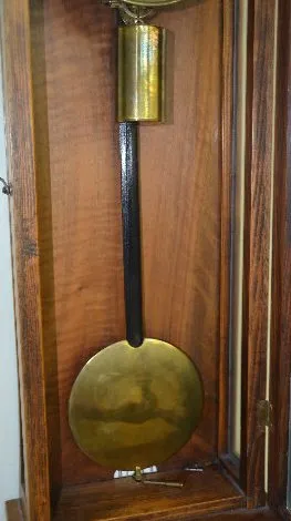 The 2 piece porcelain dial has an unreadable signature on it. There is brass trim, pendulum and weight with the clock. Not tested. (The case has been nicely refinished.) Case - 38" Long