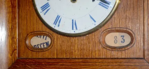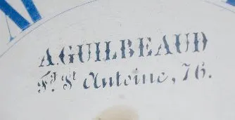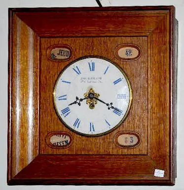 With a TO #289 movement; a celluloid dial marked "A. Guilbeaud FJ St. Antoine 76"; plus a dial for the month, day, date and year. Also, the case is marked "A.G. Brevete de 15 Ans Paris" inside on the wood. Not tested. (The case has some roughness near the hinges.) 17" Tall x 16" Wide