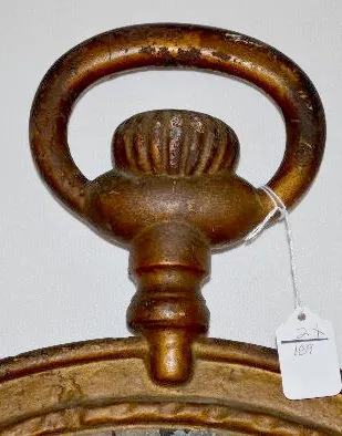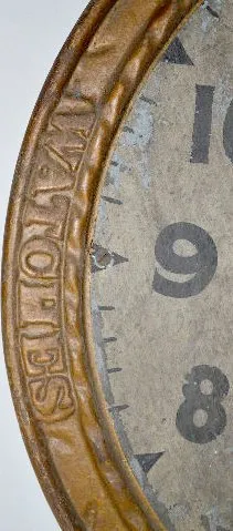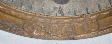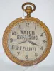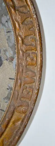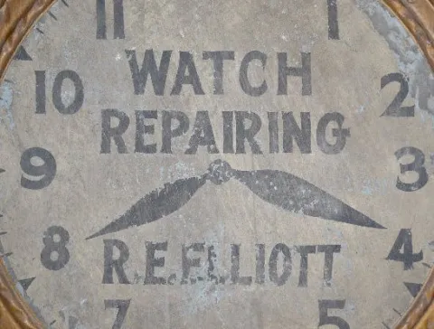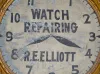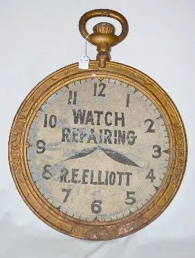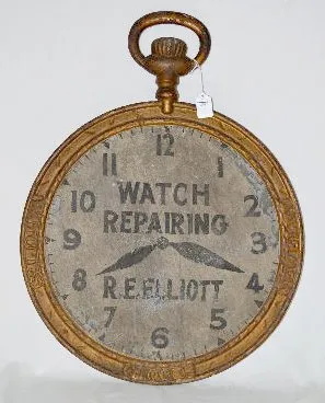 The frame is embossed with "WATCHES & CLOCKS". The tin center is advertising "Watch Repairing R.E. Elliott". (The paint is faded and worn.) 26 1/2" Ta...