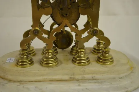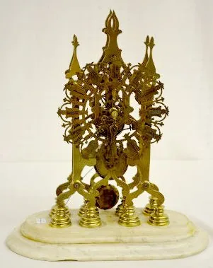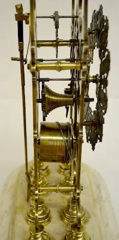 English Fusee Skeleton Clock on White Marble Base (The TO movement was originally chain driven but that has been replaced with a multi-strand wire, which is not connected at this time. The white marble base has a large chip on one end. The clock is not running at this time.) 16" Tall