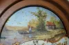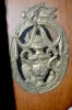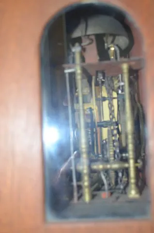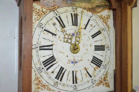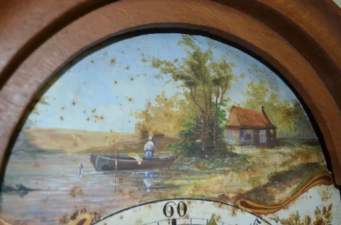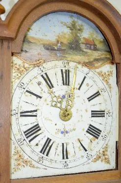 With bell strike movement and alarm anchor escapement and a painted steel dial. In an oak or ash case with chain pull which sets the alarm. The small window has brass d/(c)cor over it with an eagle on top along with owls, the sun and a flaming urn. Not tested. These clocks are sometimes referred to as Dutch Hoods. They were also made in surrounding countries and can date anywhere up to the 1870's. Dial - 10" Wide; Case - 54" Long (There is some corrosion showing on the dial.)