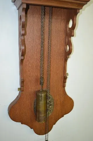 Dutch Hood Domestic Hanging Clock With bell strike movement and alarm anchor escapement and a painted steel dial. In an oak or ash case with chain pull which sets the alarm. The small window has brass d/(c)cor over it with an eagle on top along with owls, the sun and a flaming urn. Not tested. These clocks are sometimes referred to as Dutch Hoods. They were also made in surrounding countries and can date anywhere up to the 1870's. Dial - 10" Wide; Case - 54" Long (There is some corrosion showing on the dial.)