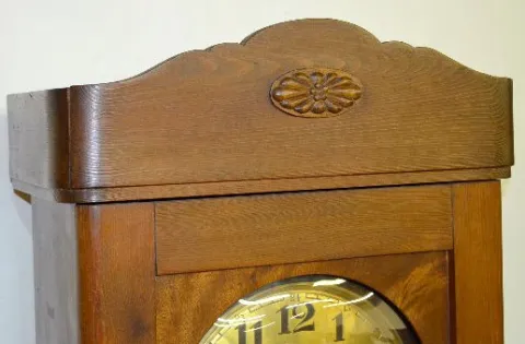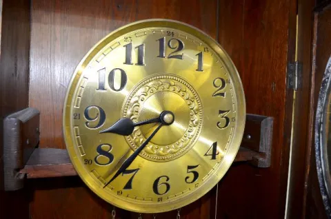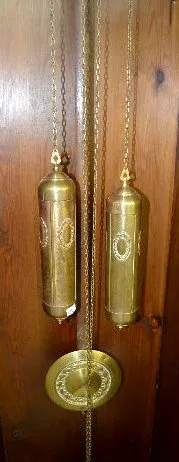 Haldo Chiming Grandfather Clock The chimes are on 5 rods. The movement Serial No. is 13561 OR 13581. It is chain wind with repeat. The dial is made of pressed brass. The case is made pine, mahogany and an assortment of other woods. Not tested. Dial - 10 1/2" Diameter; Case - 82" Tall