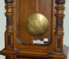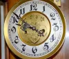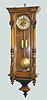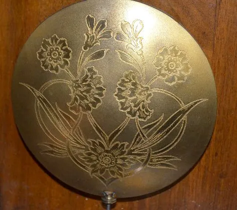 With an 8 day T&S movement; a metal dial; matching engraved pendulum and weights; has the key. In a light colored wood case with dark accents. (There is no top crest or bottom finial.) 40 1/2" Tall