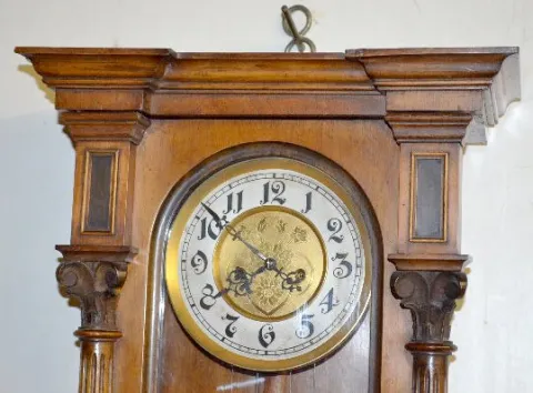 Ornate 2 Weight Vienna Regulator Clock With an 8 day T&S movement; a metal dial; matching engraved pendulum and weights; has the key. In a light colored wood case with dark accents. (There is no top crest or bottom finial.) 40 1/2" Tall
