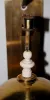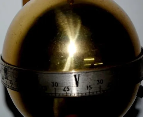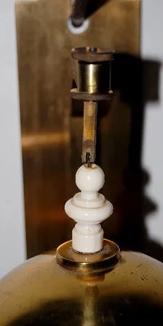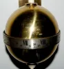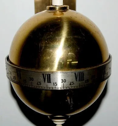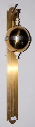 The gilt metal ball has a metal dial around the center. The hours are in Roman Numerals and the 15 minute breakdown is in Arabic numbers. The time indicator is a small arrow that is stationary. On both ends there is a carved ivory finial. The top one has a suspension rod through it to the movement. The ball is suspended from a brass plate. Not tested. (The gilt finish on the ball has a couple of blemishes.) Ball - 5" Diameter; Brass Plate - 23 3/4" Long