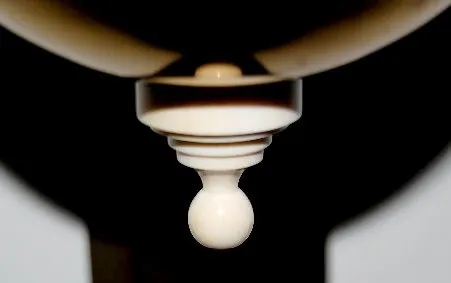 Rotating Ball Suspended Clock The gilt metal ball has a metal dial around the center. The hours are in Roman Numerals and the 15 minute breakdown is in Arabic numbers. The time indicator is a small arrow that is stationary. On both ends there is a carved ivory finial. The top one has a suspension rod through it to the movement. The ball is suspended from a brass plate. Not tested. (The gilt finish on the ball has a couple of blemishes.) Ball - 5" Diameter; Brass Plate - 23 3/4" Long