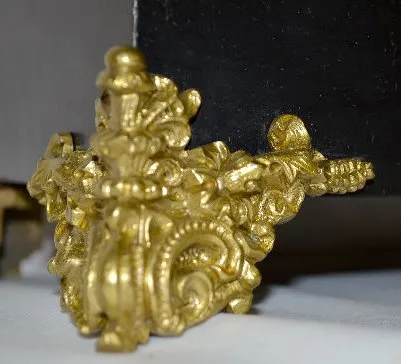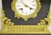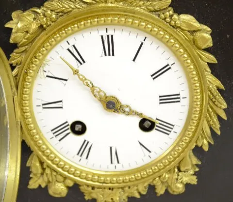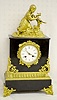 Made of bronze and slate with a silk string half hour bell striking movement, No. 599 and a porcelain dial with ornate hands and bezel. The case is topped with a young girl at a bird's nest. The clock is running and striking at this time. (The dial is fractured at the edge of the "X". The back slate piece is cracked in multiple places.) Dial - 3 1/2" Diameter; Case - 18" Tall x 10 1/4" Wide