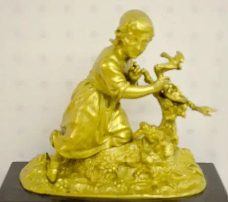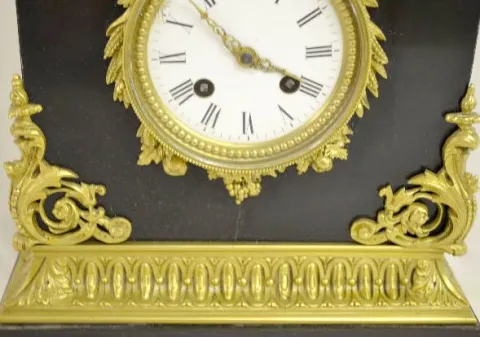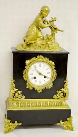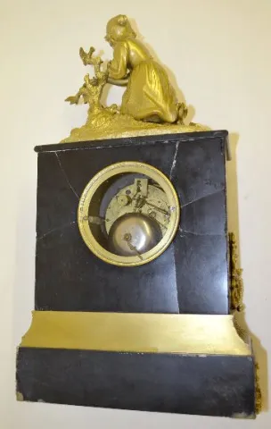 French Bronze Clock w/Girl & Birds Made of bronze and slate with a silk string half hour bell striking movement, No. 599 and a porcelain dial with ornate hands and bezel. The case is topped with a young girl at a bird's nest. The clock is running and striking at this time. (The dial is fractured at the edge of the "X". The back slate piece is cracked in multiple places.) Dial - 3 1/2" Diameter; Case - 18" Tall x 10 1/4" Wide